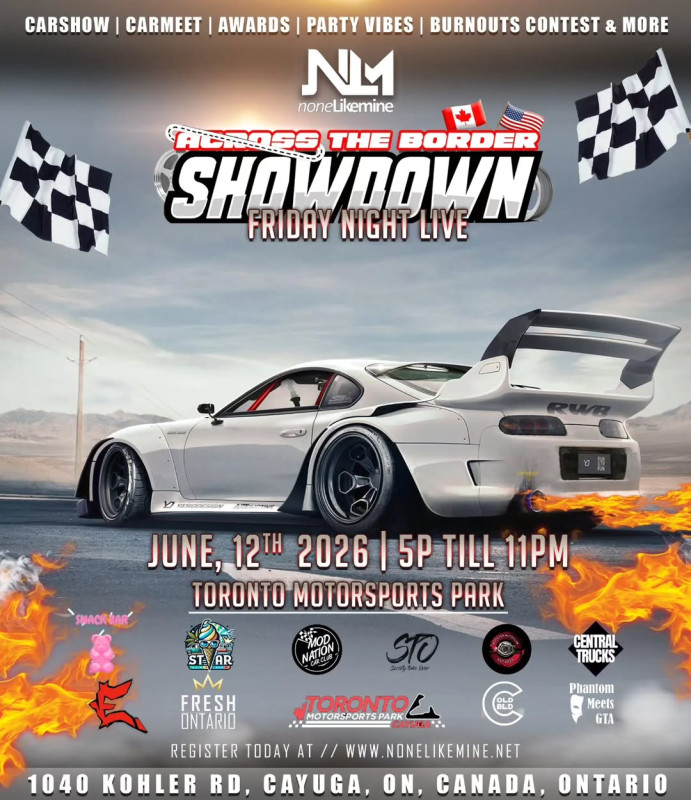 Get ready for an electrifying cross-border automotive experience as Across the Border Showdown takes over Toronto Motorsports Park. Blending New Jersey’s high-energy car culture with the Canadian scene, this event delivers a full night of adrenaline, music, and nonstop action.