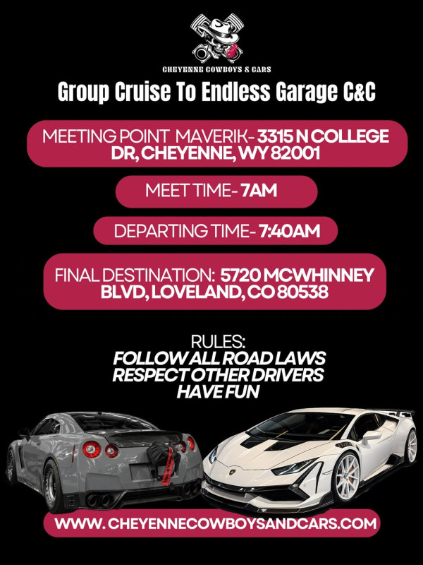 Join fellow enthusiasts for an early morning group cruise heading out from Cheyenne to the Endless Garage Cars & Coffee in Loveland, CO. This “Endless Edition” meetup brings together car lovers for a scenic drive and a chance to connect over great builds, good coffee, and an exciting community atmosphere.