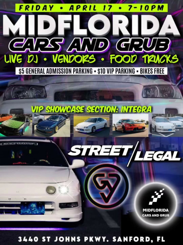 Pull up to MidFlorida Cars and Grub for a high-energy night featuring street-legal builds, live music, and a strong community vibe. With a dedicated Integra VIP showcase and a full lineup of cars, vendors, and food trucks, this event brings together enthusiasts for a night of cars and connection.