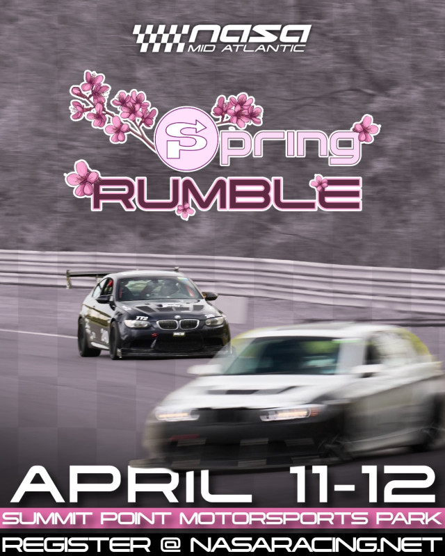 Get ready for a full weekend of high-performance track action at the NASA Mid-Atlantic Spring Rumble. This event brings drivers and racing enthusiasts together at Summit Point Motorsports Park for an adrenaline-filled experience featuring competitive track sessions and a vibrant motorsports atmosphere.