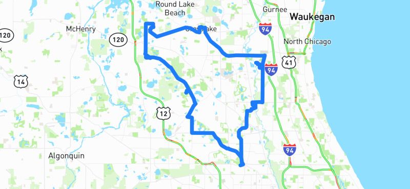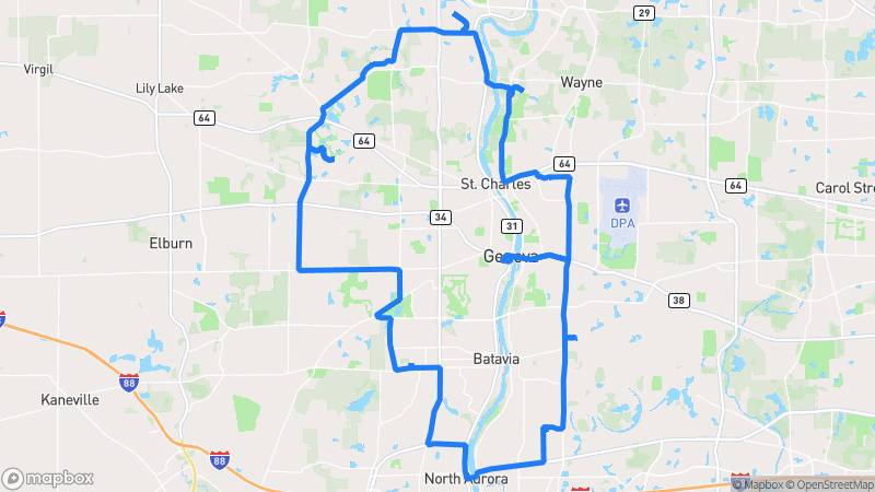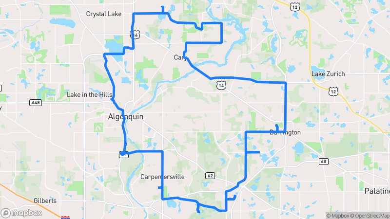 A picturesque drive along the Fox River Valley featuring riverside views, forest preserves, and quaint suburban landscapes with a mix of gentle curves and straight sections.Fox River Scenic Loop