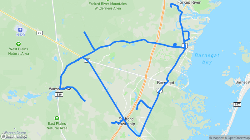 A picturesque drive through New Jersey's Pine Barrens featuring winding country roads, serene forest views, and tranquil waterways.Pine Barrens Scenic Loop