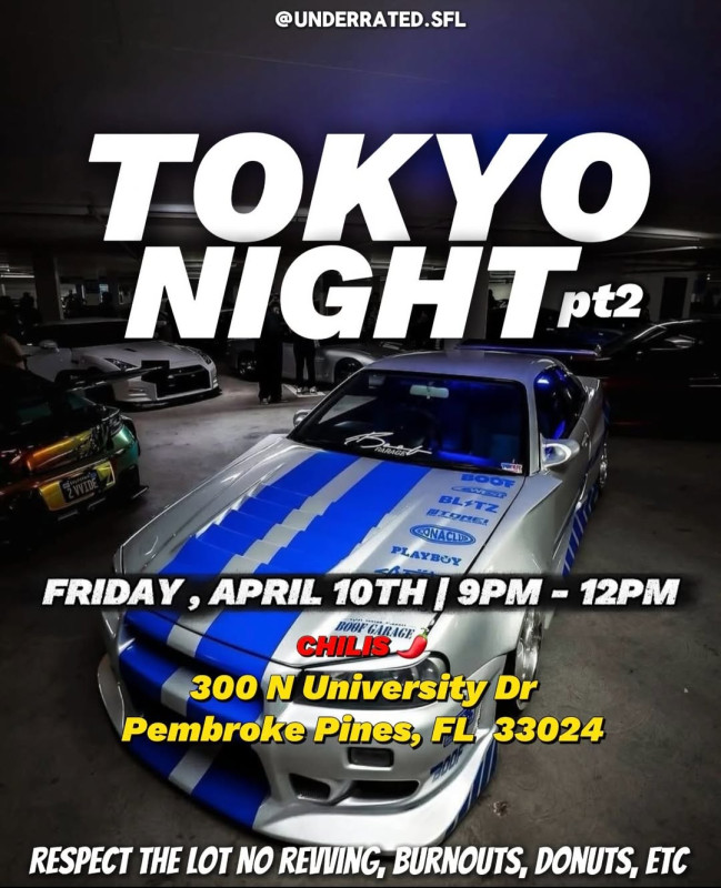 Tokyo Night pt.2 is back, bringing late-night JDM vibes and a chill car meet atmosphere to Pembroke Pines. Expect a lineup of clean builds, great energy, and a community of enthusiasts gathering for a night of cars and good vibes.